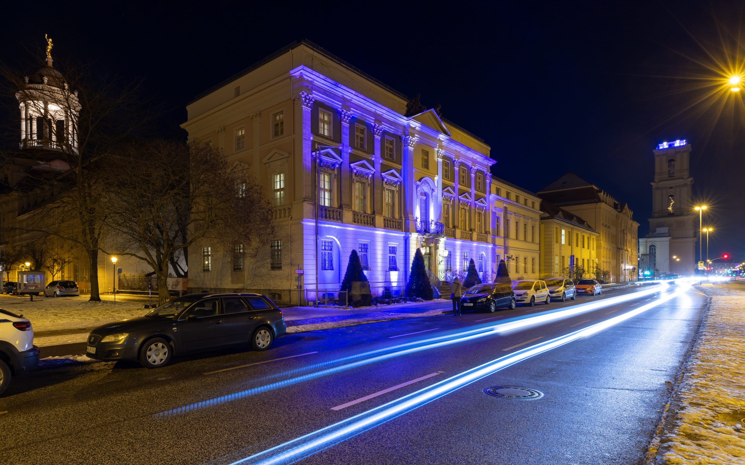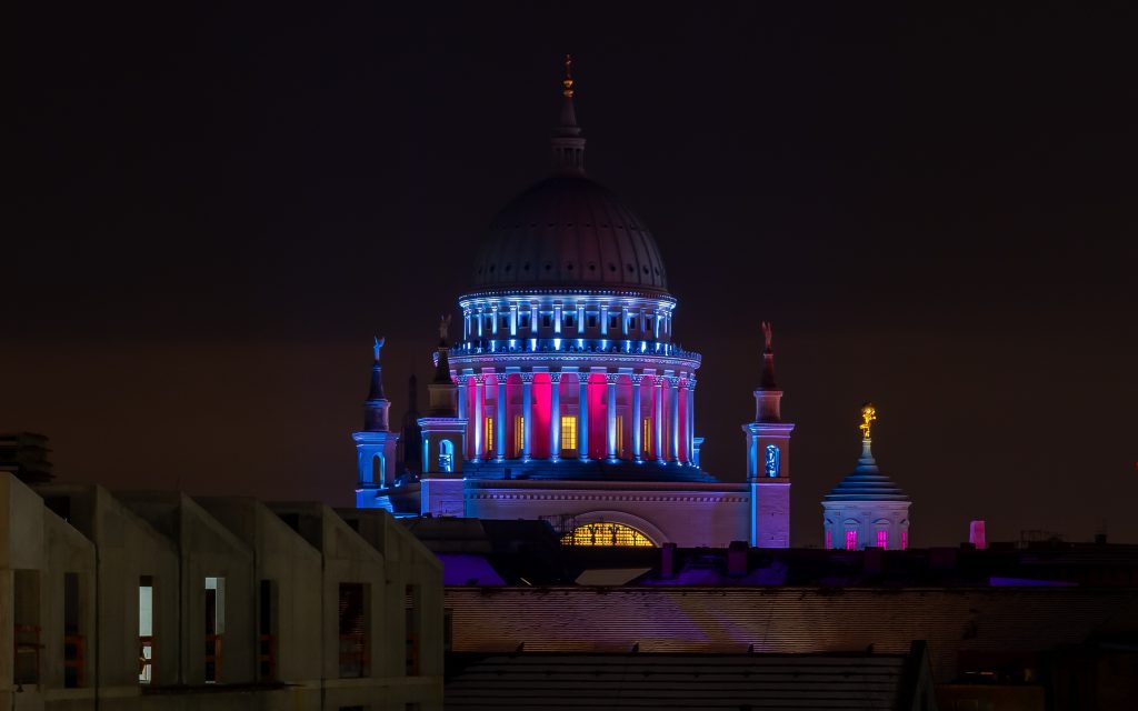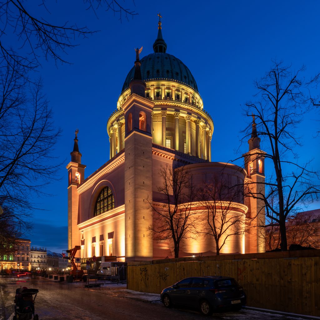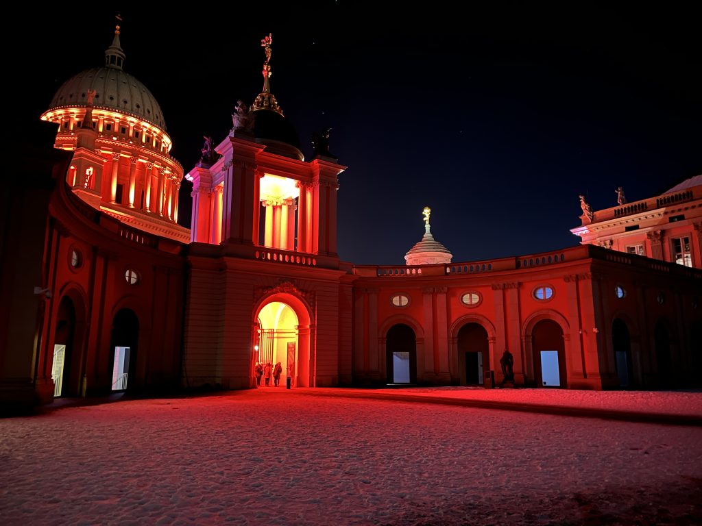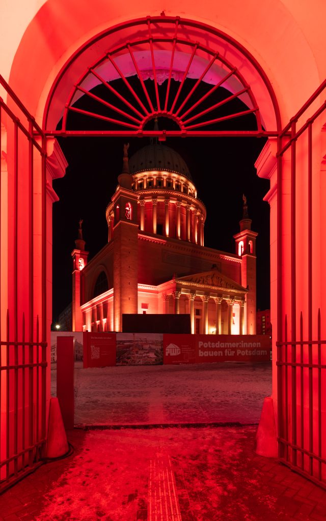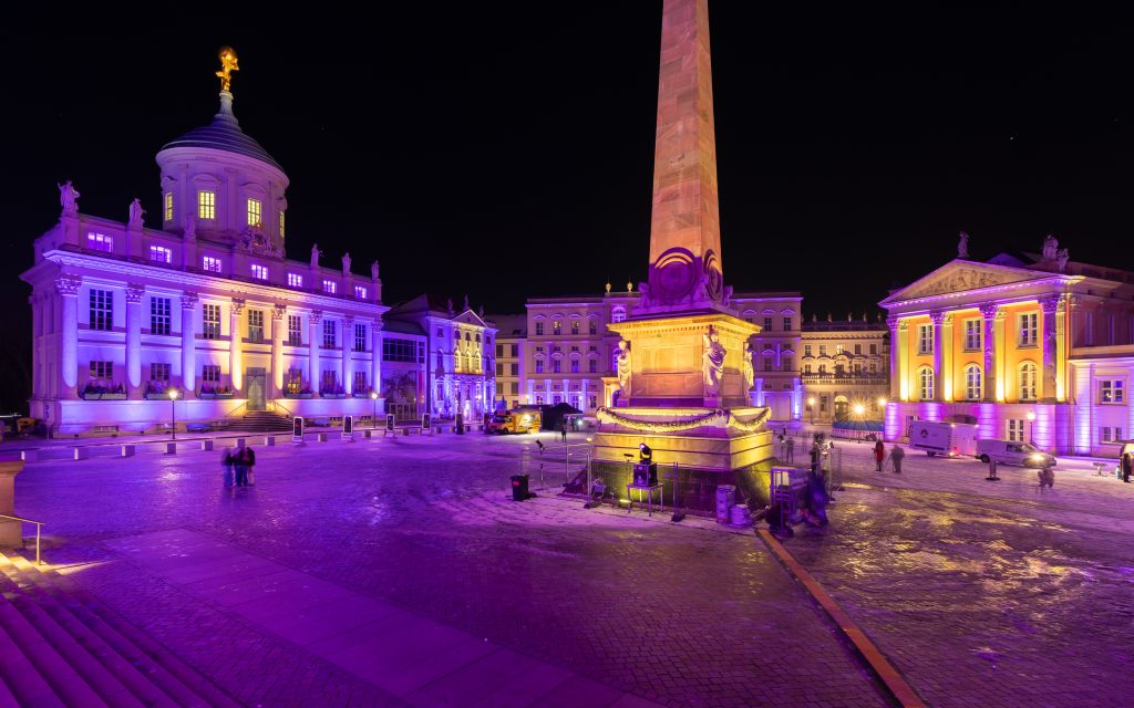 Mit dem ersten Akt wird die Struktur und Dynamik der bevorstehenden Akten vorgegeben – analoge Farbzusammensetzungen mit gelegentlich auftretenden Komplementärakzenten bestimmen die Farbinszenierung der Potsdamer Stadtmitte/Umgebung. Die Beleuchtung bewegt sich vorläufig im Farbenraum Gelb-Orange-Grün.