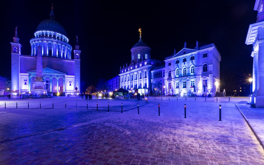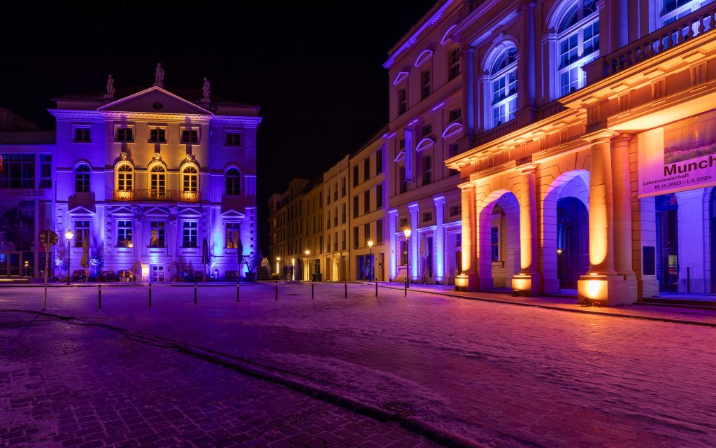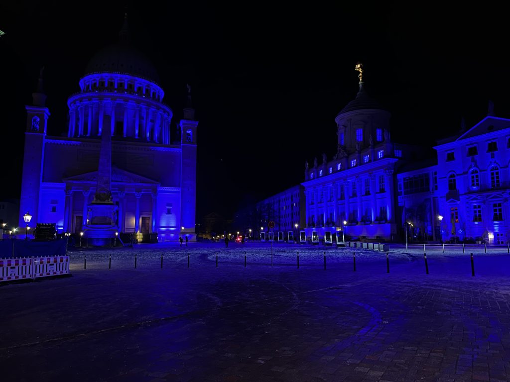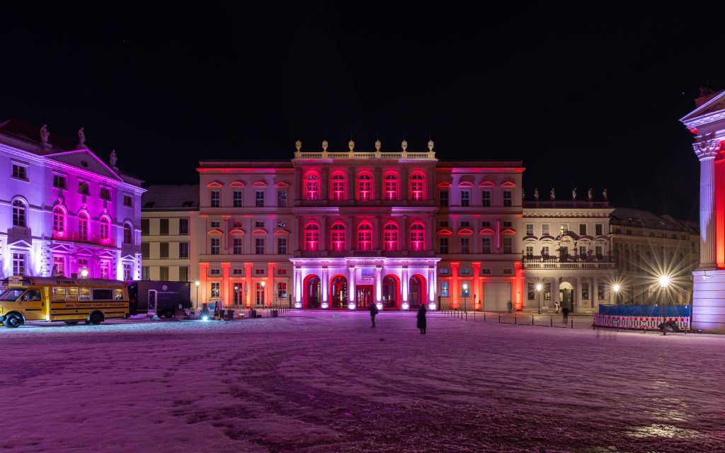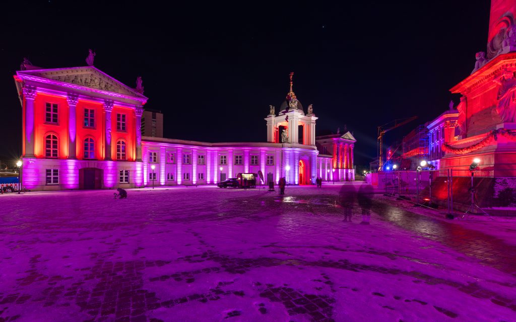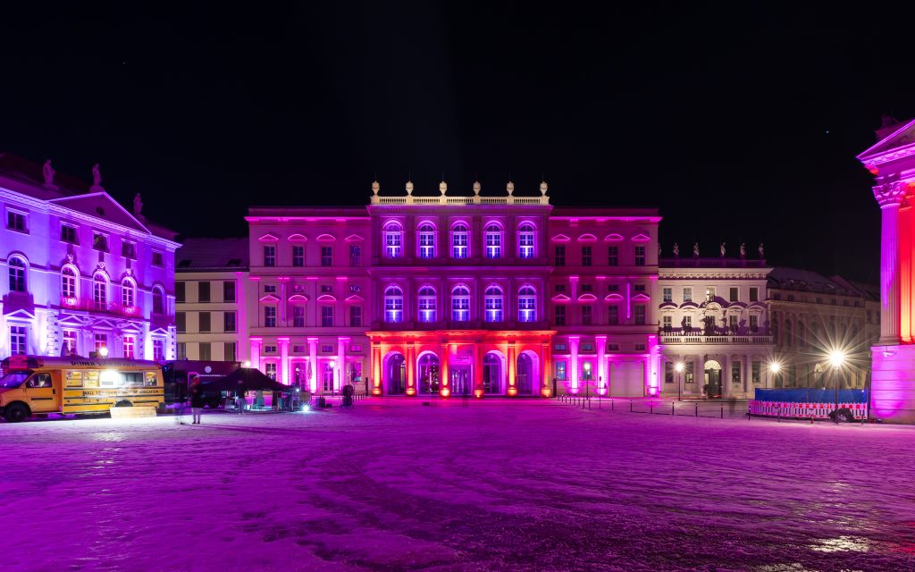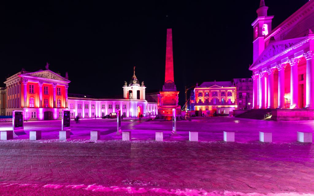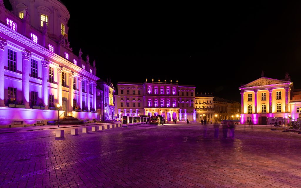 Anlässlich des kulturellen Programmes, welches eine Feuershow und einen Auftritt einer Kindertanzgruppe vorsieht, gehen die den Alten Markt umgebenden Bauwerke in einen dunkleren, gedimmten Blauton über und begleiten mit warmen Farbkontrasten im jeweils oberen Fassadenbereich die Veranstaltung.