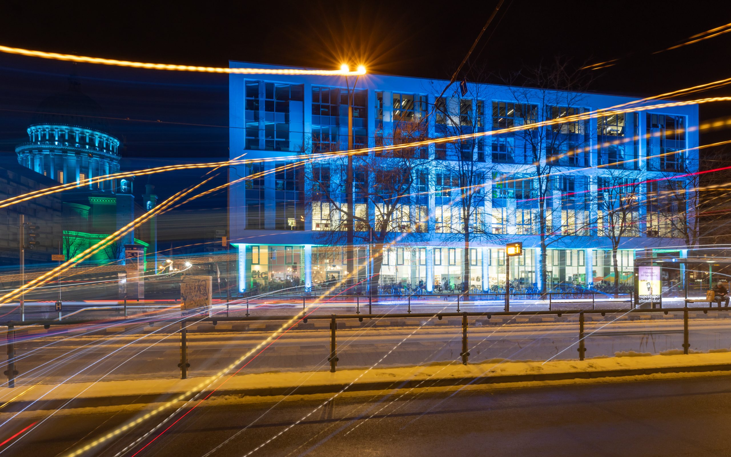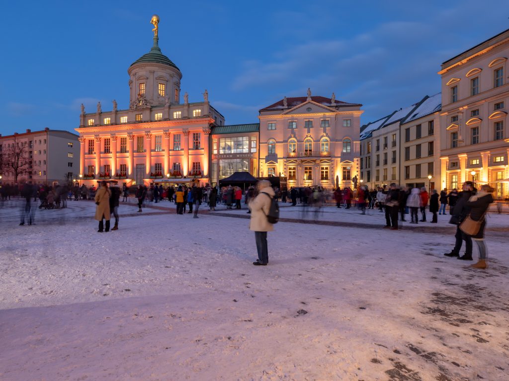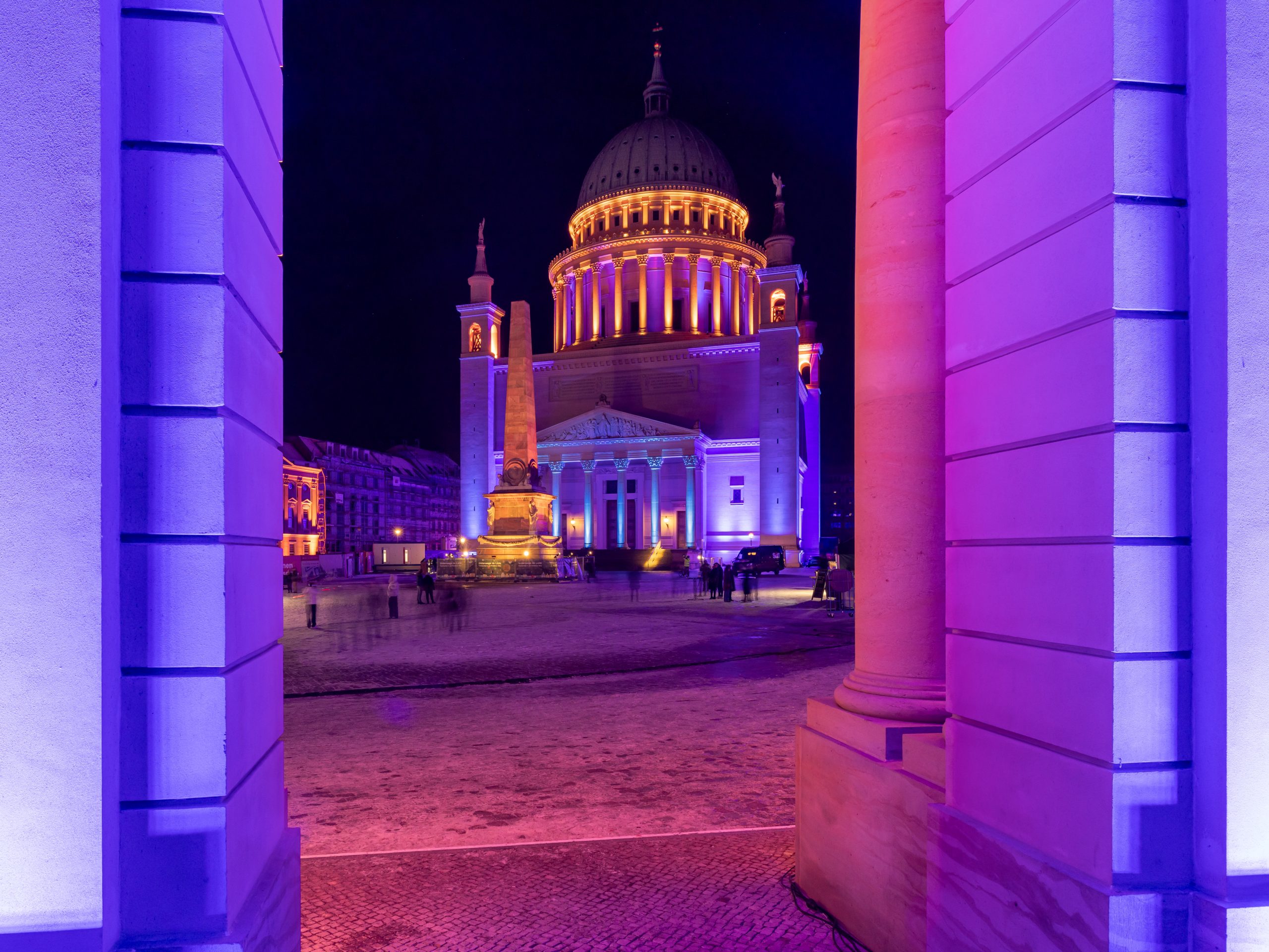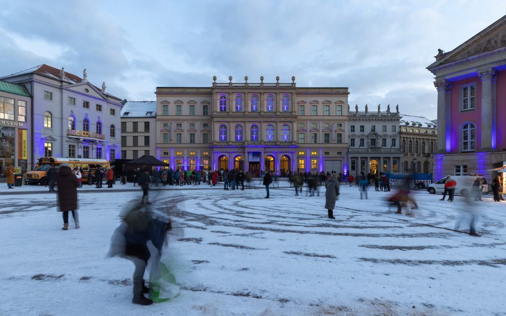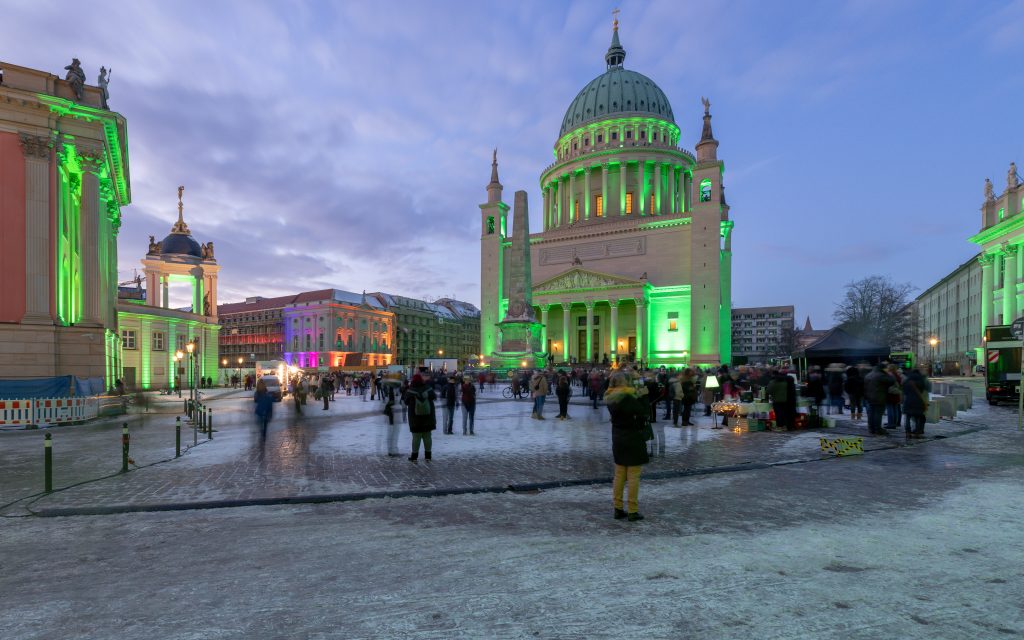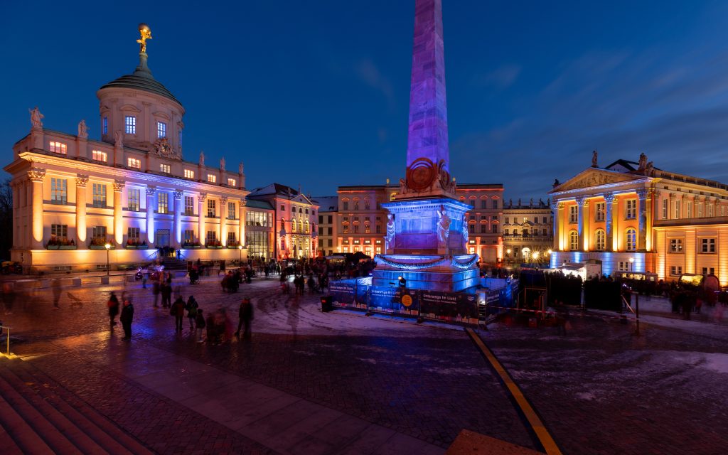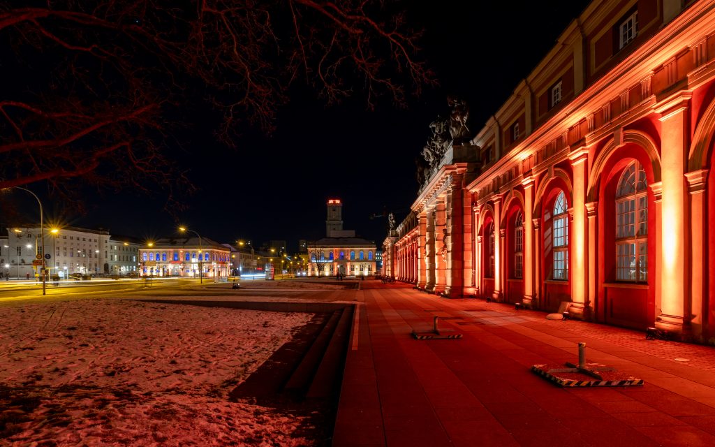 Anlässlich des kulturellen Programmes, welches eine Feuershow und einen Auftritt einer Kindertanzgruppe vorsieht, gehen die den Alten Markt umgebenden Bauwerke in einen dunkleren, gedimmten Blauton über und begleiten mit warmen Farbkontrasten im jeweils oberen Fassadenbereich die Veranstaltung.