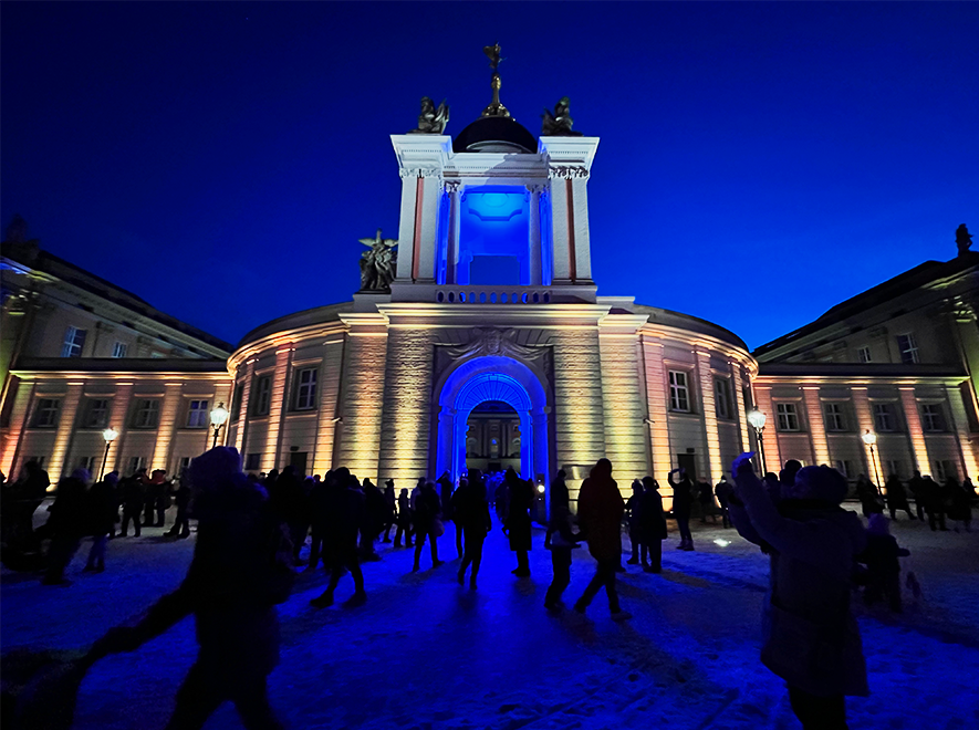 Anlässlich des kulturellen Programmes, welches eine Feuershow und einen Auftritt einer Kindertanzgruppe vorsieht, gehen die den Alten Markt umgebenden Bauwerke in einen dunkleren, gedimmten Blauton über und begleiten mit warmen Farbkontrasten im jeweils oberen Fassadenbereich die Veranstaltung.