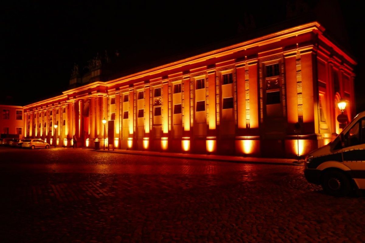 Ein eingefangener Lichtmoment aus der gestern zu „Unterwegs im Licht 2020“ im Zentrum der Brandenburger Landeshauptstadt Potsdam aufgeführten 7-stündigen Lichtkomposition „Puls der Geschichte“ von Ruairí O’Brien. Das Bild zeigt eine Lichtstimmung am Landtag.