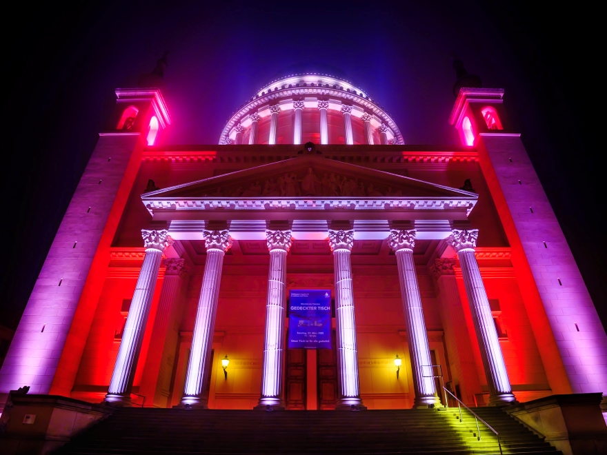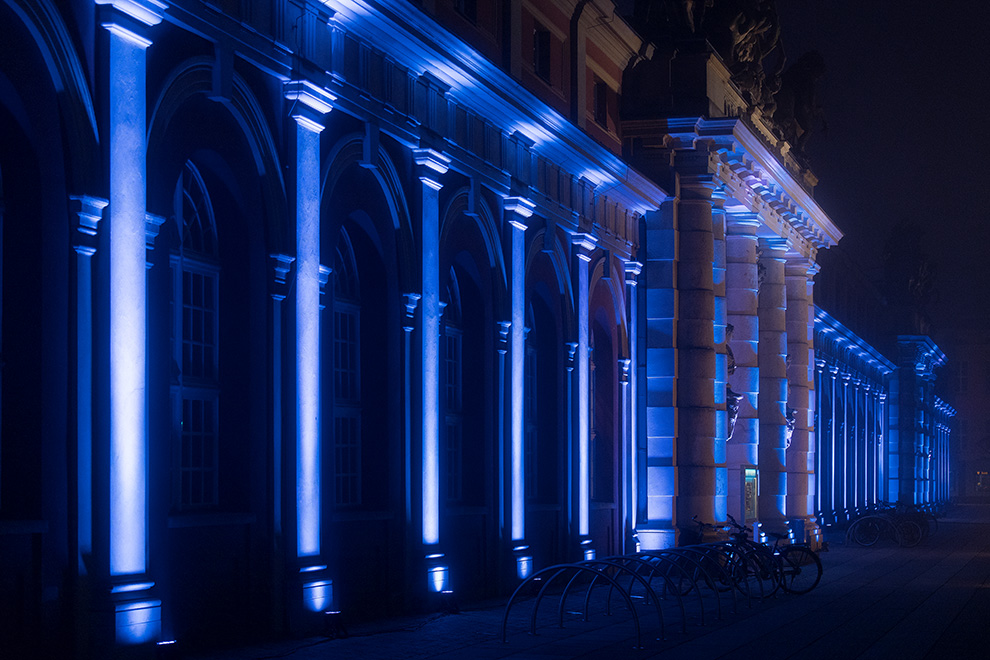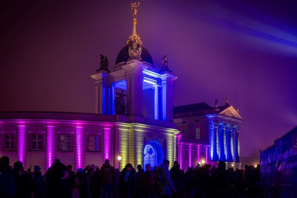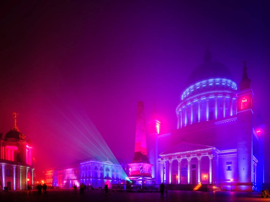 Die kunstvolle Soundless-Music Lichtkomposition O’Briens bewegte sich von der Dämmerung bis in den späteren Abend hinein an 21 teilnehmenden Bauwerken der Innenstadt – darunter der Alte Markt, der Stadtkanal und die im Wiederaufbau befindliche Garnisonkirche – simultan und synchron durch den Farbkreis der spektralen Lichtfarben.