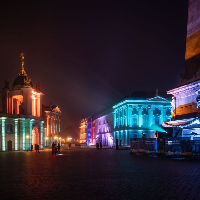 Die kunstvolle Soundless-Music Lichtkomposition O’Briens bewegte sich von der Dämmerung bis in den späteren Abend hinein an 21 teilnehmenden Bauwerken der Innenstadt – darunter der Alte Markt, der Stadtkanal und die im Wiederaufbau befindliche Garnisonkirche – simultan und synchron durch den Farbkreis der spektralen Lichtfarben.